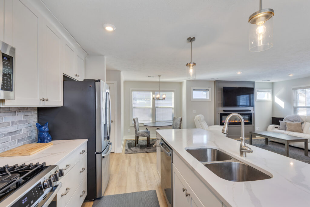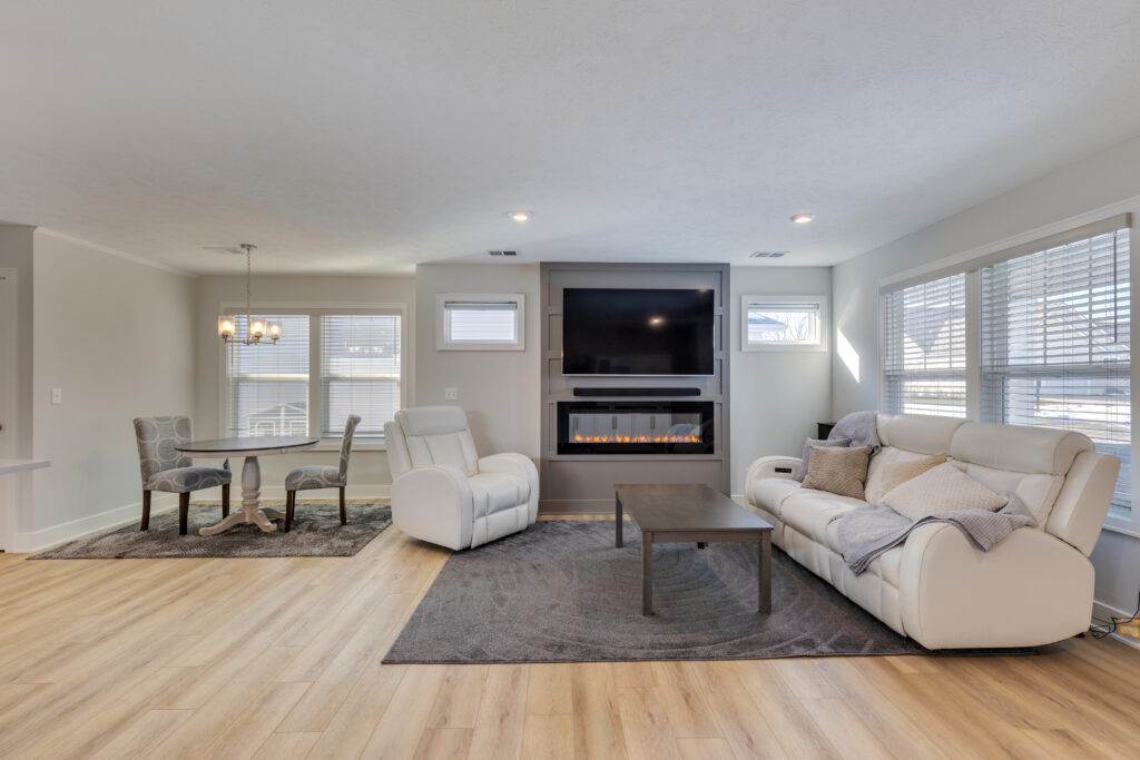 From the moment you walk in, the open-concept design invites you to relax and settle in. Natural light pours through elegant transom windows, highlighting the seamless flow between the living room, dining area, and kitchen. Whether you’re hosting friends or enjoying a quiet night in by the electric fireplace, the space feels both functional and inviting.